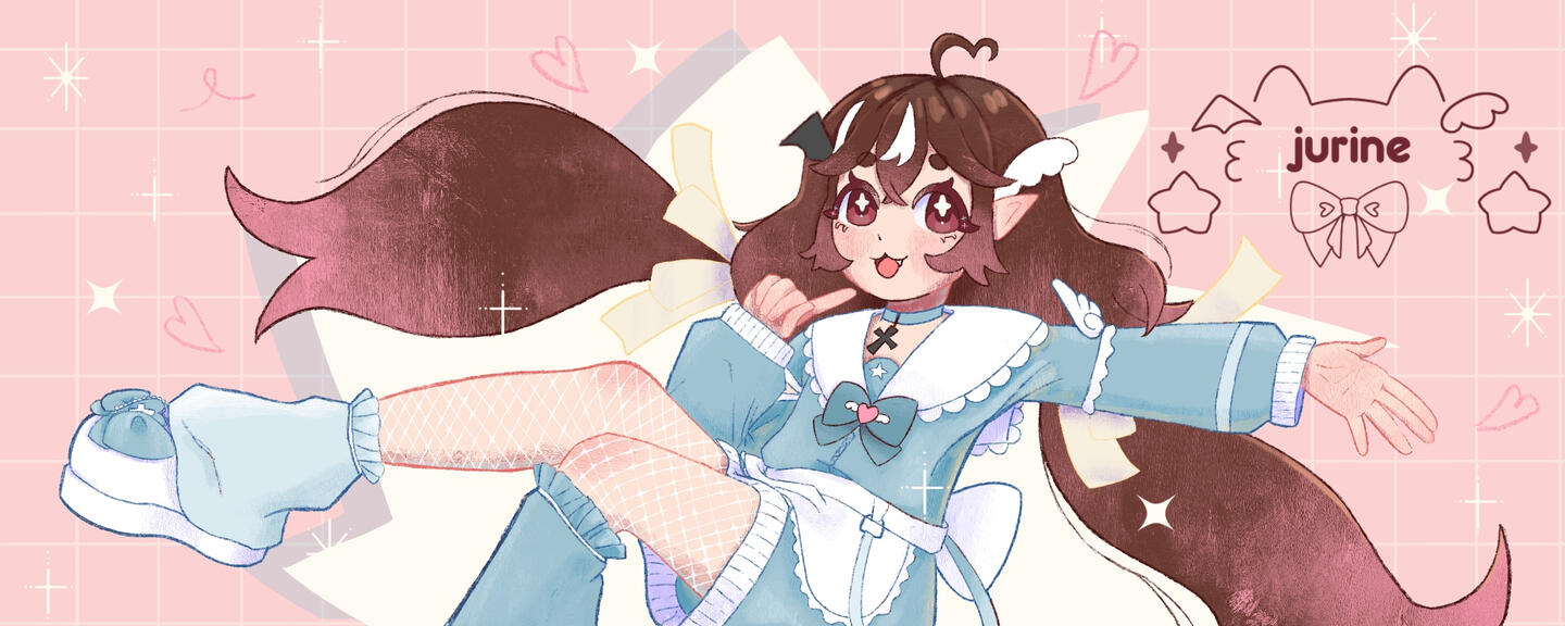 Seja bem-vindo ao meu site!Muito prazer, eu sou a Jurine, uma meia-vampira vegetariana que faz lives, desenha e ama animaizinhos! Aqui você vai encontrar curiosidades sobre mim, minhas redes sociais, artes e informações sobre commissions! 𖹭